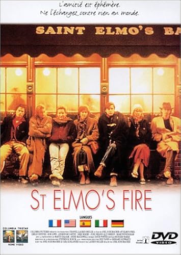 St. Elmo's Fire: Amazon: Emilio Estevez, Rob Lowe ~ St. Elmo's Fire is a 1985 coming-of-age film and centres on a clique of recent graduates and their adjustment to life after university and the responsibilities of adulthood. The film opens at the local hospital following an unseen crash involving some of their friends, the group then head to their local bar –St Elmo’s.